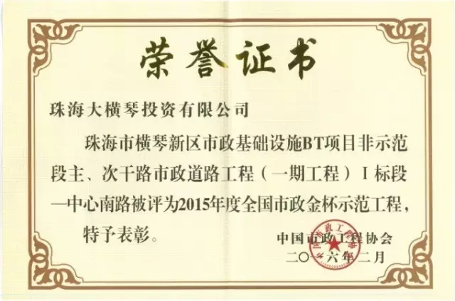 2016年8月5日中國市政工程協(xié)會(huì )為橫琴新區市政基礎設施BT項目非示范段主、次干路市政道路工程(一期工程)I標段-中心南路,頒發(fā)了“2015年度全國市政金杯示范工程”獎狀和獎杯。全國市政金杯示范工程是我國市政行業(yè)在工程質(zhì)量方面的最高榮譽(yù)。
